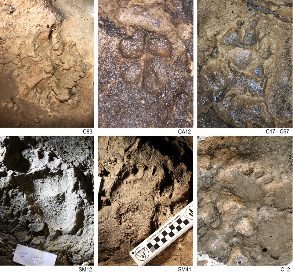 Сверху — следы собаки или волка, снизу — следы медведя. Federico De Sario et al. / Quaternary Science Reviews